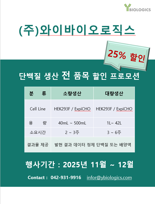 이벤트 진행중 [할인] 단백질 생산 25% 할인 기간 : 2025.11.01 ~ 2025.12.31 첨부파일 목록 이전글 [Conference] The Korea Association of Immunologists Conference 2025 다음글 [Promotion] Recombinant Protein Production 25% off